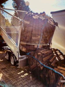Das Brennholz wird auf einem kippbaren Anhänger geliefert, auf dem sich 2 BigBags transportieren lassen.